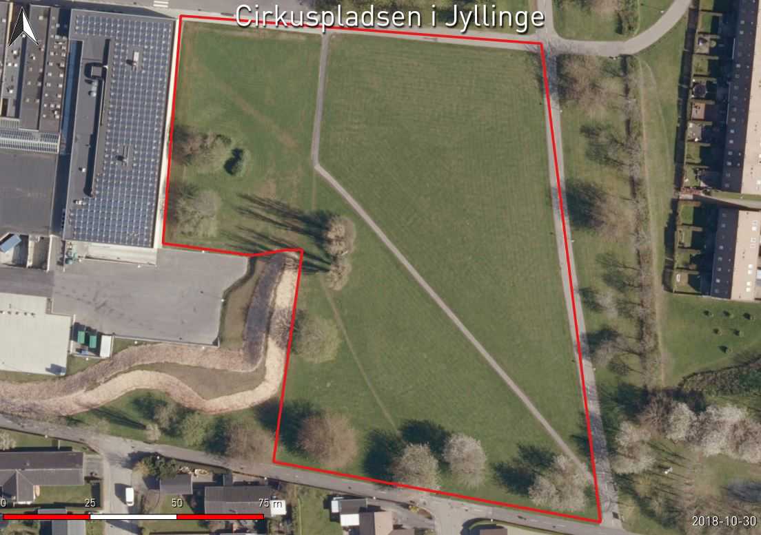 Se luftfoto over Cirkuspladsen ved Jyllinge Centret